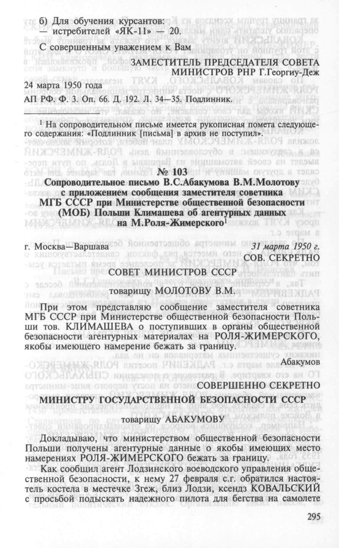Сопроводительное письмо В.С.Абакумова В.М.Молотову с приложением сообщения заместителя советника МГБ СССР при Министерстве общественной безопасности (МОЕ) Польши Климашева об агентурных данных на М.Роля-Жимерского. Москва—Варшава, 31 марта 1950 г.