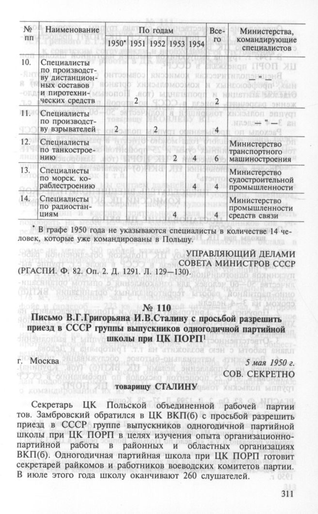 Письмо В.Г.Григорьяна И.В.Сталину с просьбой разрешить приезд в СССР группы выпускников одногодичной партийной школы при ЦК ПОРП. Москва, 5 мая 1950 г. // РГАСПИ. Ф. 82. Оп. 2. Д. 1299. Л. 27-28. Копия.