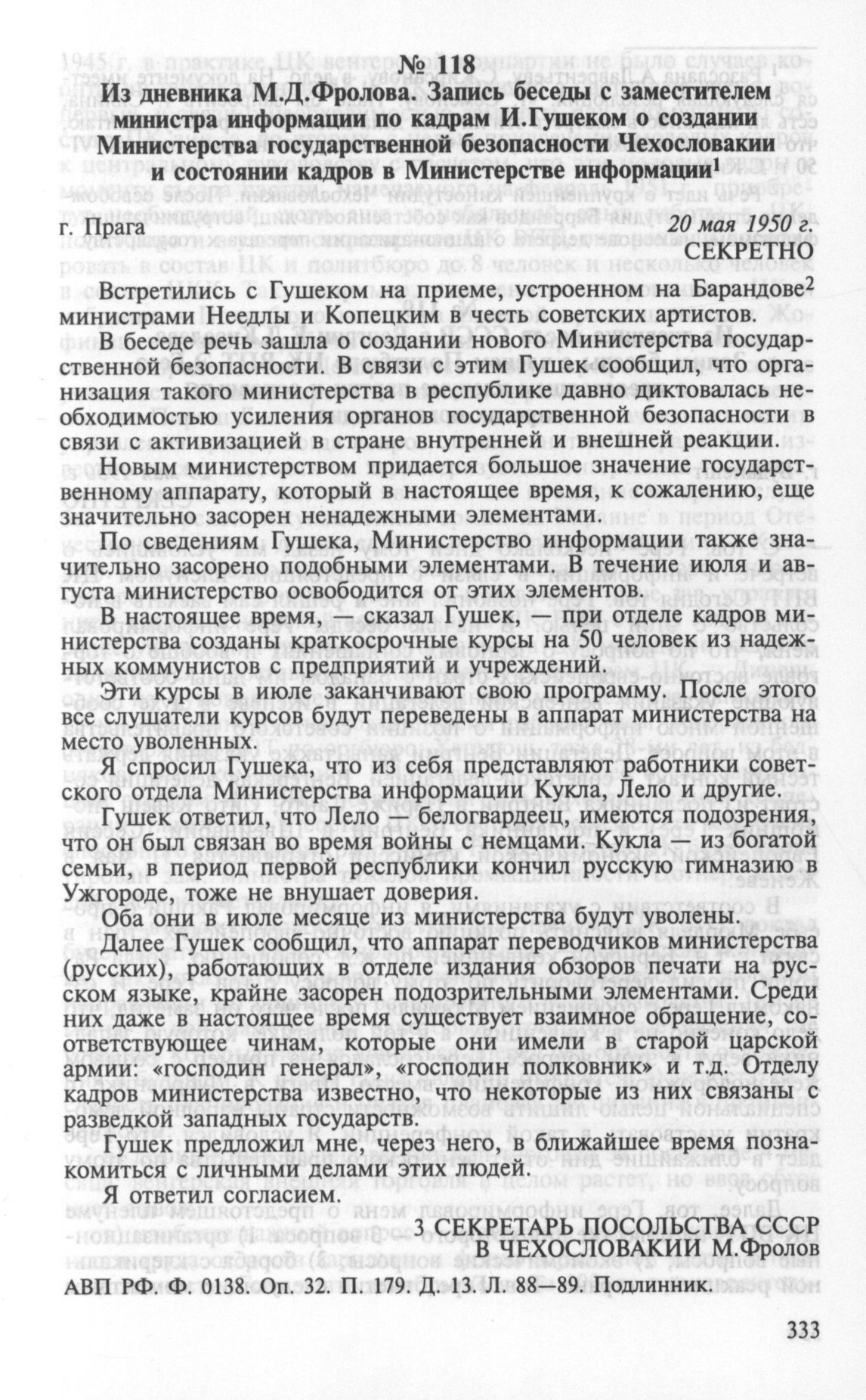 Из дневника М.Д.Фролова. Запись беседы с заместителем министра информации по кадрам И.Гушеком о создании Министерства государственной безопасности Чехословакии и состоянии кадров в Министерстве информации. Прага, 20 мая 1950 г. // АВП РФ. Ф. 0138. Оп. 32. П. 179. Д. 13. Л. 88-89. Подлинник.