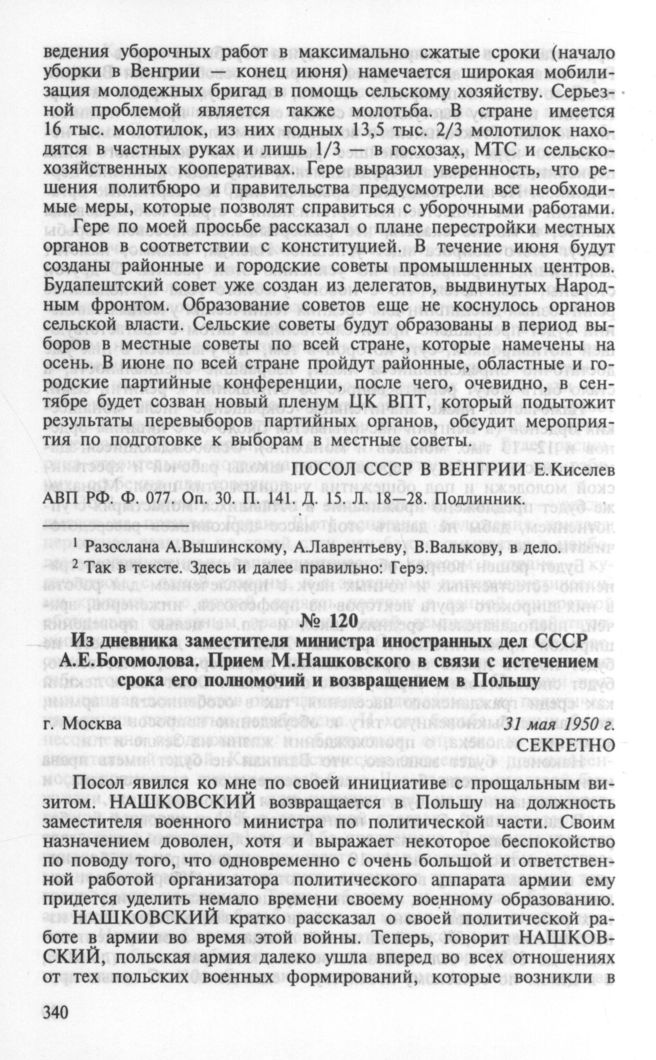 Из дневника заместителя министра иностранных дел СССР А.Е.Богомолова. Прием М.Нашковского в связи с истечением срока его полномочий и возвращением в Польшу. Москва, 31 мая 1950 г.
