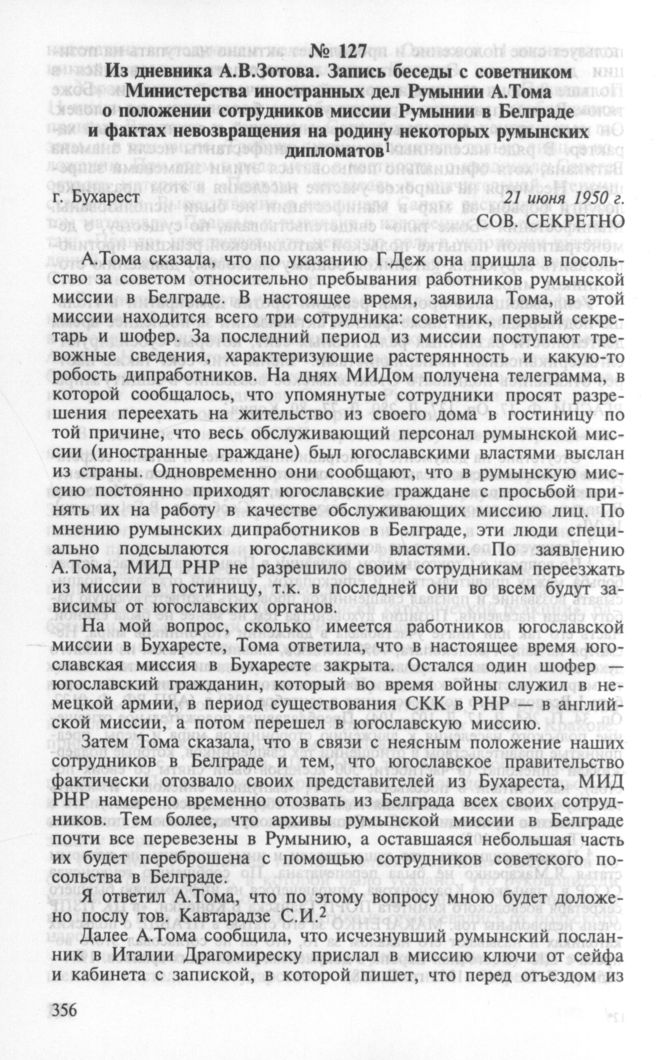Из дневника А.В.Зотова. Запись беседы с советником Министерства иностранных дел Румынии А.Тома о положении сотрудников миссии Румынии в Белграде и фактах невозвращения на родину некоторых румынских дипломатов. Бухарест, 21 июня 1950 г. // АВП РФ. Ф. 0125. Оп. 38. П. 177. Д. 16. Л. 37-38. Подлинник.
