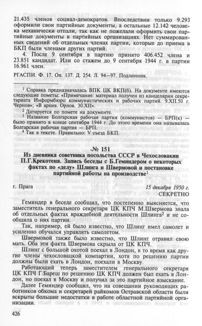 Из дневника советника посольства СССР в Чехословакии П.Г.Крекотеня. Запись беседы с Б.Геминдером о некоторых фактах по «делу» Шлинга и Швермовой и постановке партийной работы на производстве. Прага, 15 декабря 1950 г. // АВП РФ. Ф. 0138. Оп. 32. П. 179. Д. 14. Л. 206—208. Подлинник.