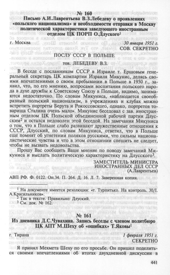 Из дневника Д.С.Чувахина. Запись беседы с членом политбюро ЦК АПТ М.Шеху об «ошибках» Т.Яковы. Тирана, 1 февраля 1951 г. // АВП РФ. Ф. 07. Оп. 26. П. 44. Д. 58. Л. 31—32. Подлинник.