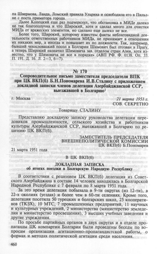 Сопроводительное письмо заместителя председателя ВПК при ЦК ВКП(б) Б.Н.Пономарева И.В.Сталину с приложением докладной записки членов делегации Азербайджанской ССР, выезжавшей в Болгарию. Москва, 21 марта 1951 г. // АП РФ. Ф. 3. Оп. 64. Д. 271. Л. 43—52. Подлинник.