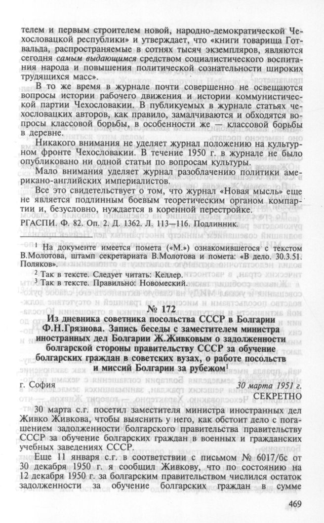Из дневника советника посольства СССР в Болгарии Ф.Н.Грязнова. Запись беседы с заместителем министра иностранных дел Болгарии Ж.Живковым о задолженности болгарской стороны правительству СССР за обучение болгарских граждан в советских вузах, о работе посольств и миссий Болгарии за рубежом. София, 30 марта 1951 г. // АВП РФ. Ф. 023. Оп. 36. П. 24. Д. 16. Л. 7-10. Копия.