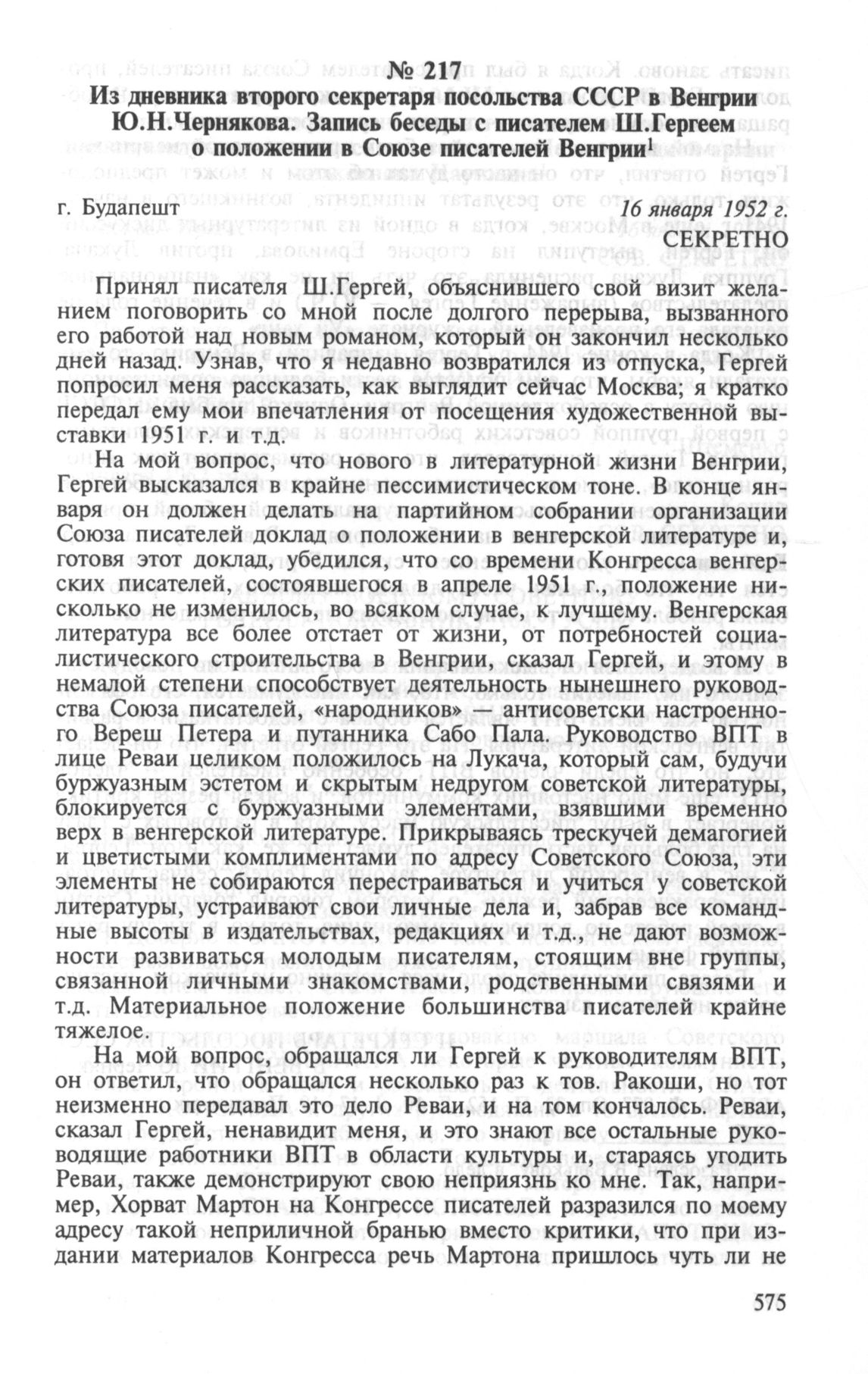 Из дневника второго секретаря посольства СССР в Венгрии Ю.Н.Чернякова. Запись беседы с писателем Ш.Гергеем о положении в Союзе писателей Венгрии. Будапешт, 16 января 1952 г. // АВП РФ. Ф. 077. Оп. 32. П. 152. Д. 10. Л. 17—19. Подлинник.
