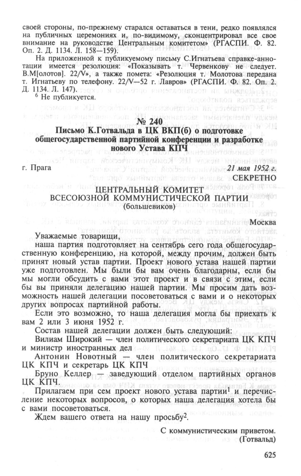 Письмо К.Готвальда в ЦК ВКП(б) о подготовке общегосударственной партийной конференции и разработке нового Устава КПЧ. Прага, 21 мая 1952 г. // РГАСПИ. Ф. 17. Оп. 137. Д. 861. Л. 80-81. Копия.