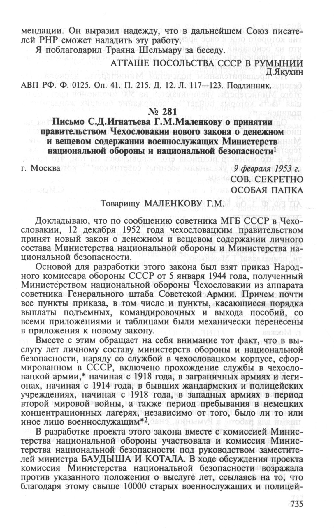 Письмо С.Д.Игнатьева Г.М.Маленкову о принятии правительством Чехословакии нового закона о денежном и вещевом содержании военнослужащих Министерств национальной обороны и национальной безопасности. Москва, 9 февраля 1953 г. // АП РФ. Ф. 3. Оп. 66. Д. 806. Л. 81—82. Подлинник.