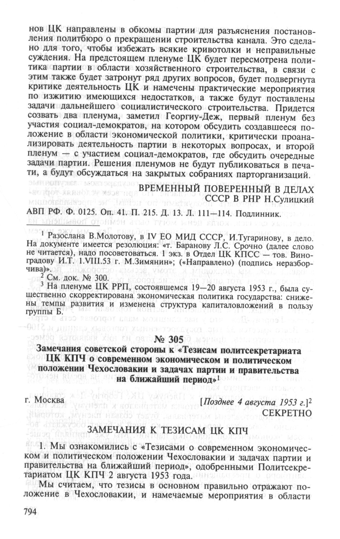 Замечания советской стороны к «Тезисам политсекретариата ЦК КПЧ о современном экономическом и политическом положении Чехословакии и задачах партии и правительства на ближайший период». Москва, позднее 4 августа 1953 г. // АП РФ. Ф. 3. Оп. 66. Д. 807. Л. 44—52. Копия.