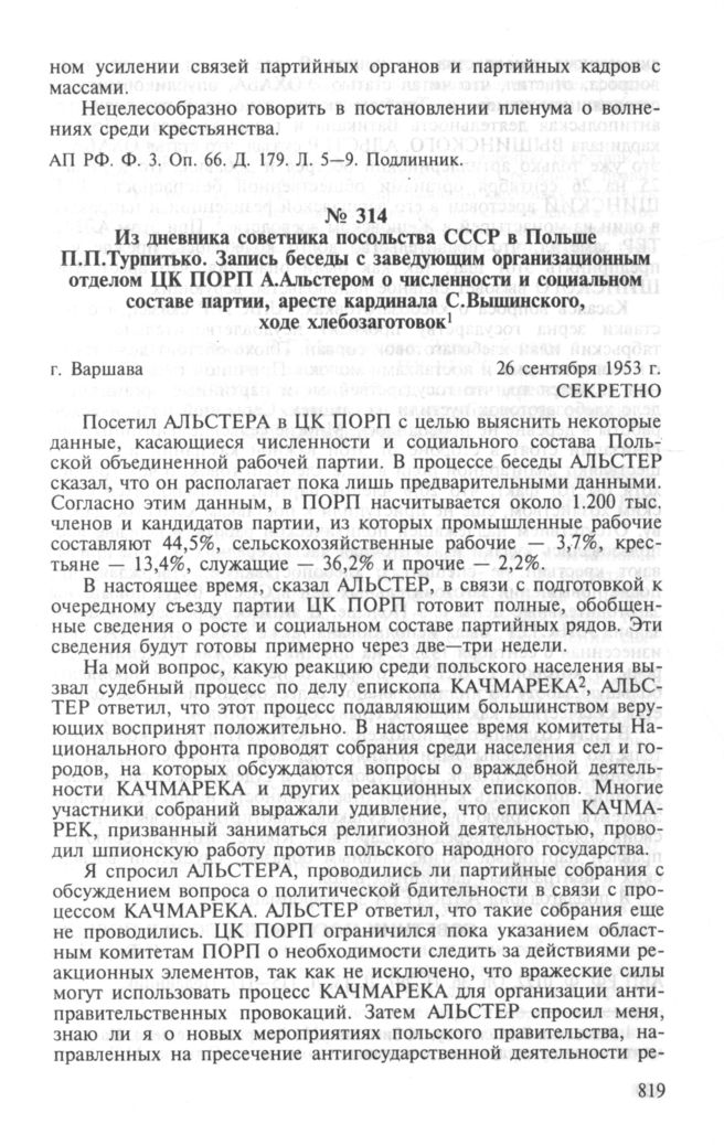 Из дневника советника посольства СССР в Польше П.П.Турпитько. Запись беседы с заведующим организационным отделом ЦК ПОРП А.Альстером о численности и социальном составе партии, аресте кардинала С.Вышинского, ходе хлебозаготовок. Варшава, 26 сентября 1953 г.