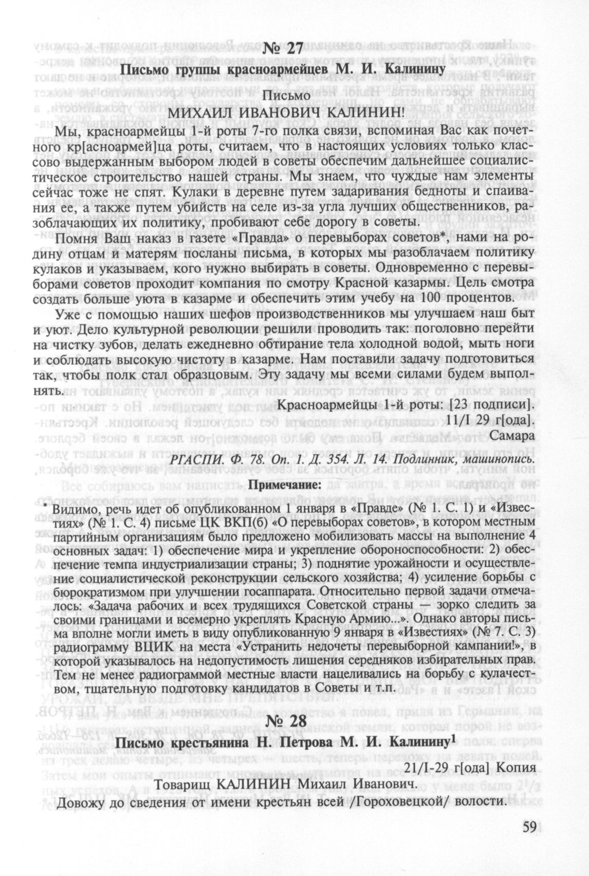Письмо группы красноармейцев М. И. Калинину. 11 января 1929 г. // РГАСПИ. Ф. 78. Оп. 1. Д. 354. Л. 14. Подлинник, машинопись.