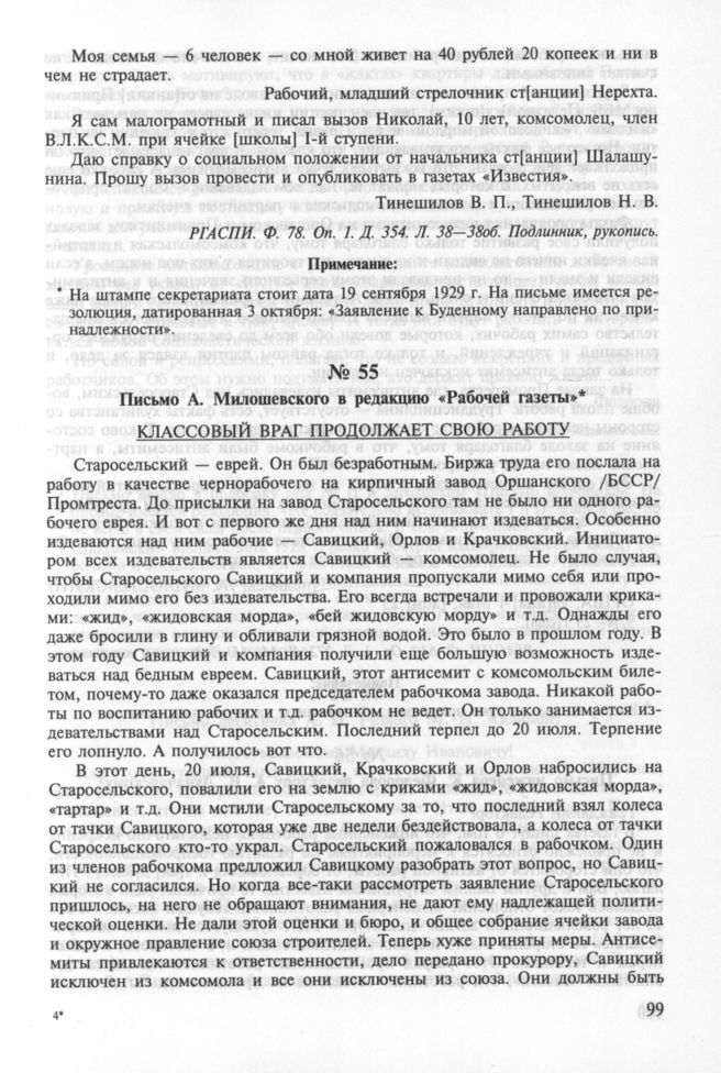 Письмо А. Милошевского в редакцию «Рабочей газеты». 9 октября 1929 г. // РГАСПИ. Ф. 610. Оп. 1. Д. 272. Л. 14—15. Подлинник, машинопись.