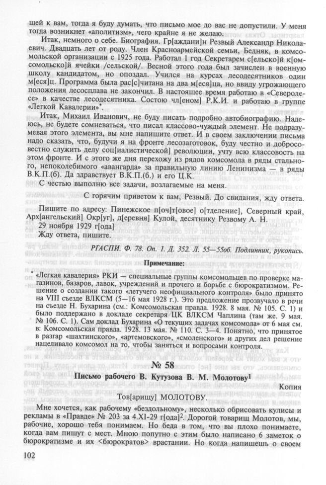 Письмо рабочего В. Кутузова В. М. Молотову. Не ранее 4 ноября 1929 г. // РГАСПИ. Ф. 82. Оп. 2. Д. 1450. Л. 128—129. Заверенная копия, машинопись.