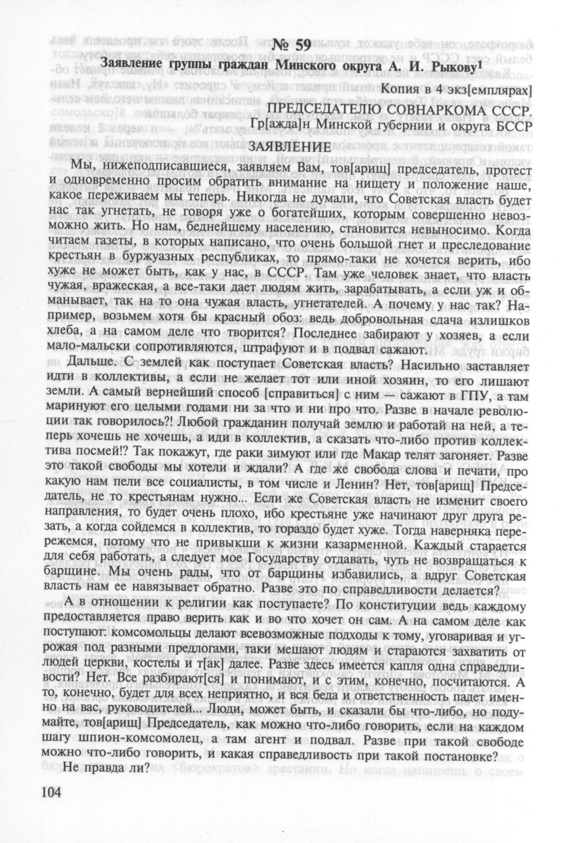 Заявление группы граждан Минского округа А. И. Рыкову. 4 декабря 1929 г. // ГА РФ. Ф. P-5446. Оп. 89. Д. 16. Л. 231—231об. Заверенная копия, машинопись.