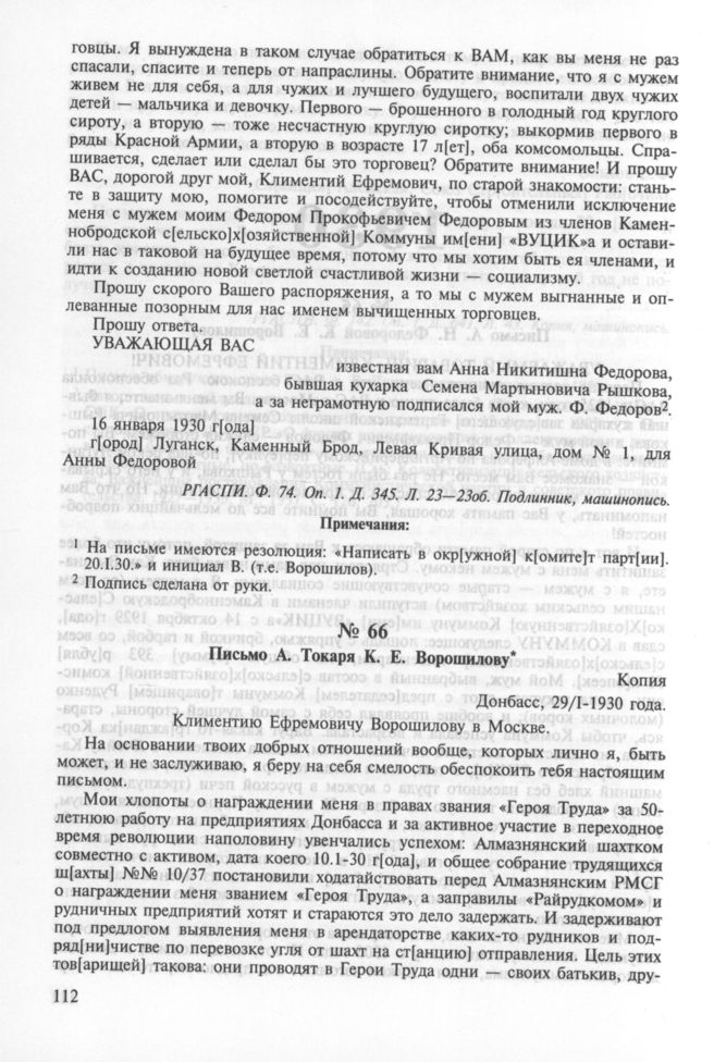 Письмо А. Токаря К. Е. Ворошилову. 29 января 1930 г. // РГАСПИ. Ф. 74. Оп. 1. Д. 344. Л. 25—26. Копия, машинопись.