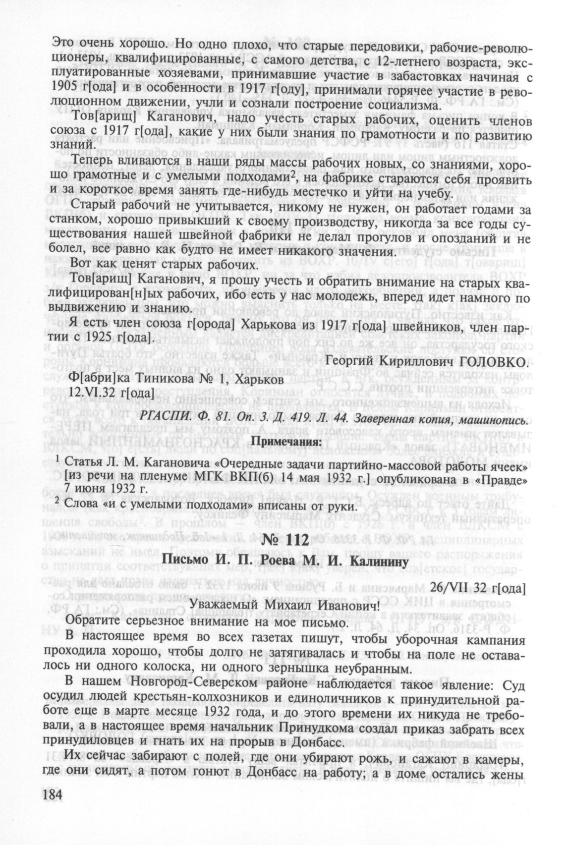 Письмо И. П. Роева М. И. Калинину. 26 июля 1932 г. // ГА РФ. Ф. P-3316. Оп. 34. Д. 72. Л. 1—2. Подлинник, рукопись.