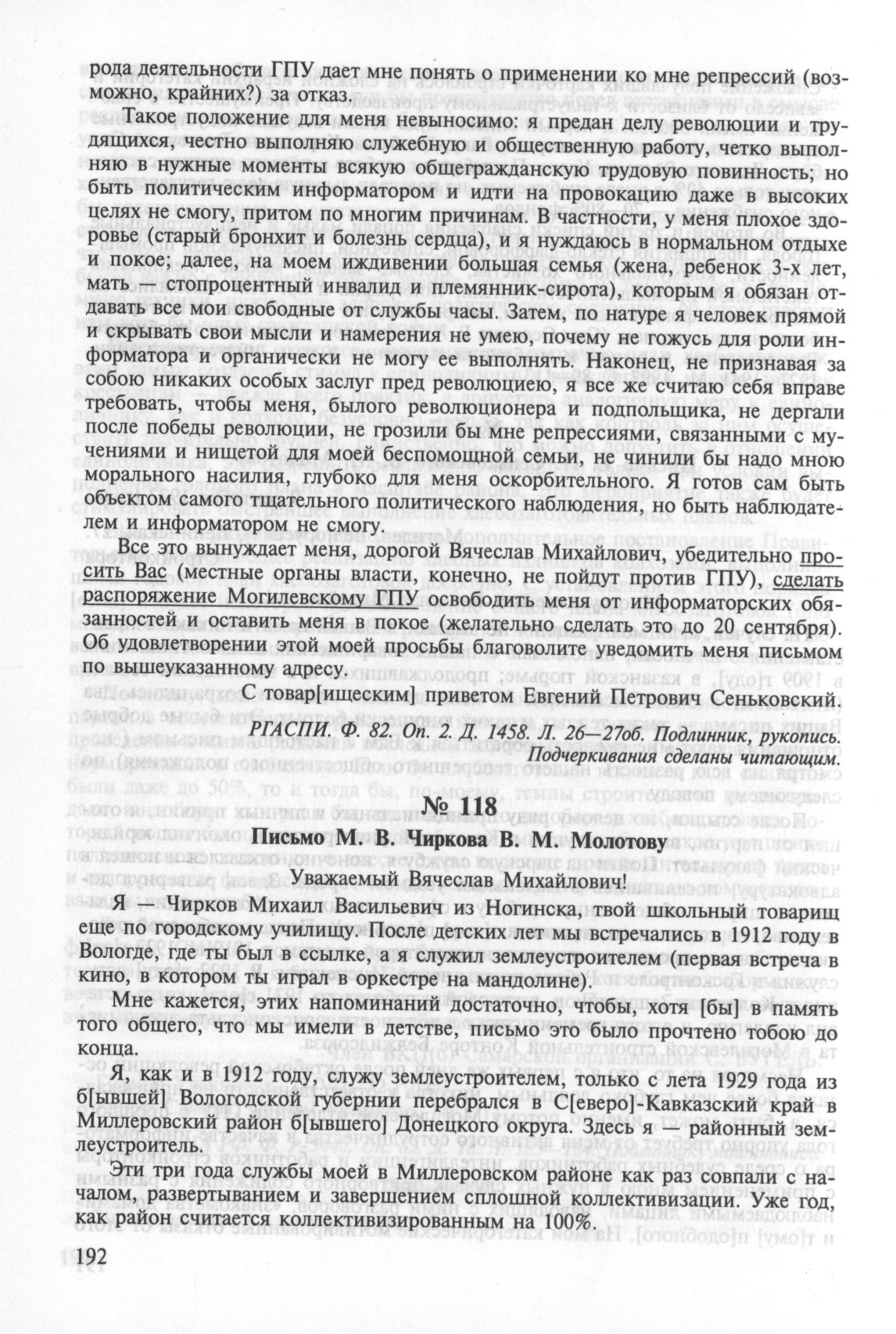 Письмо М. В. Чиркова В. М. Молотову. 6 сентября 1932 г. // РГАСПИ. Ф. 82. Оп. 2. Д. 1463. Л. 43—50об. Подлинник, рукопись.