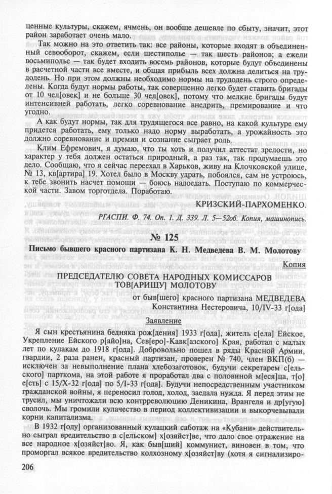 Письмо бывшего красного партизана К. Н. Медведева В. М. Молотову. 10 апреля 1933 г.