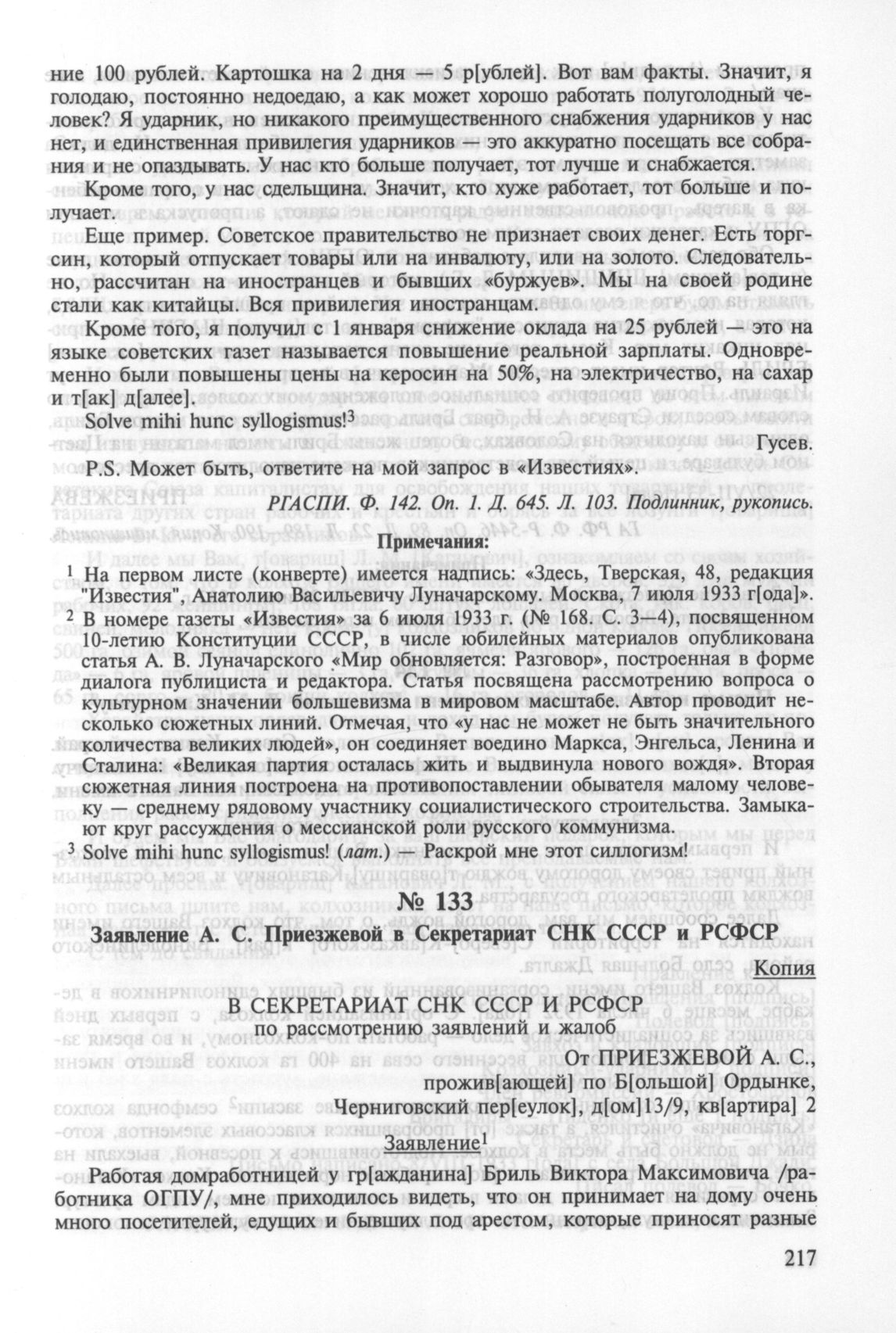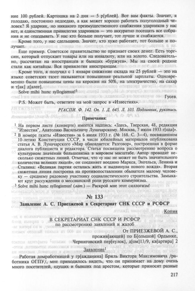 Заявление А. С. Приезжевой в Секретариат СНК СССР и РСФСР. 22 июля 1933 г. // ГА РФ. Ф. P-5446. Оп. 89. Д. 22. Л. 189-190. Копия, машинопись.