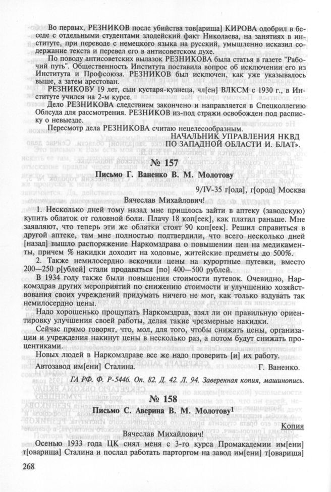 Письмо Г. Ваненко В. М. Молотову. 9 апреля 1935 г. // ГА РФ. Ф. P-5446. Оп. 82. Д. 42. Л. 94. Заверенная копия, машинопись.