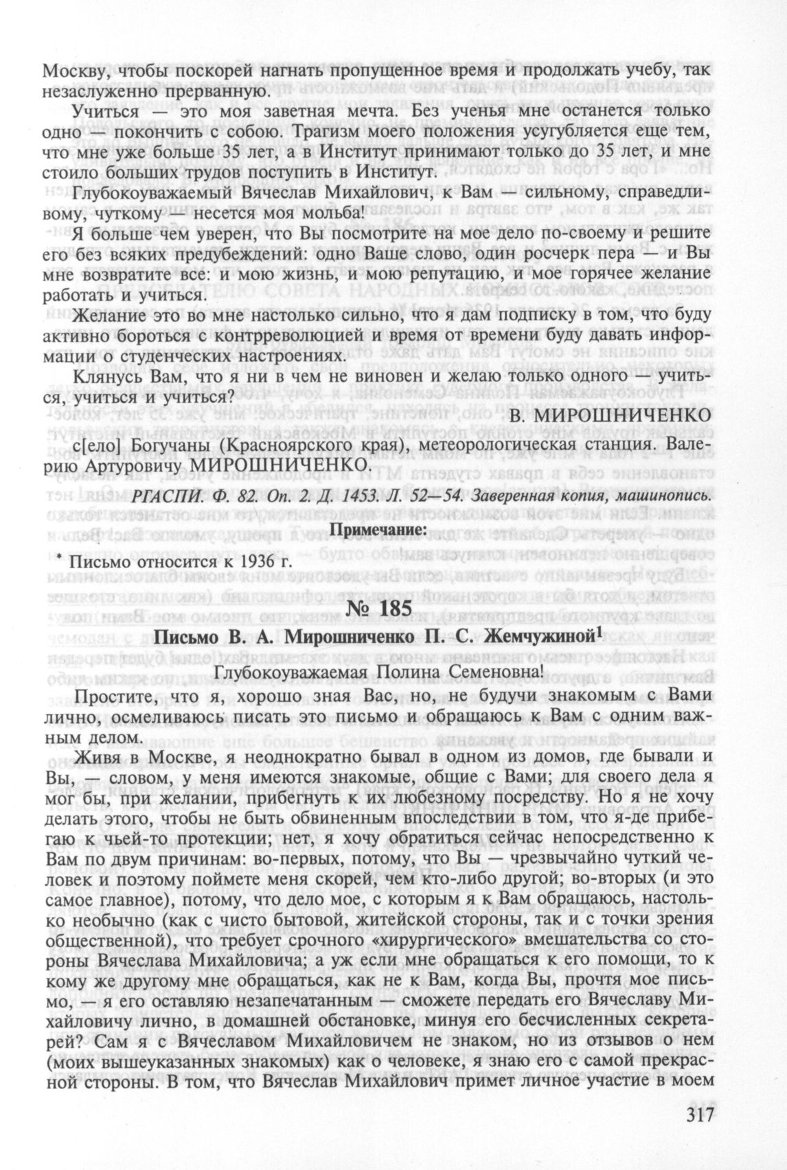 Письмо В. А. Мирошниченко П. С. Жемчужиной. 1936 г.