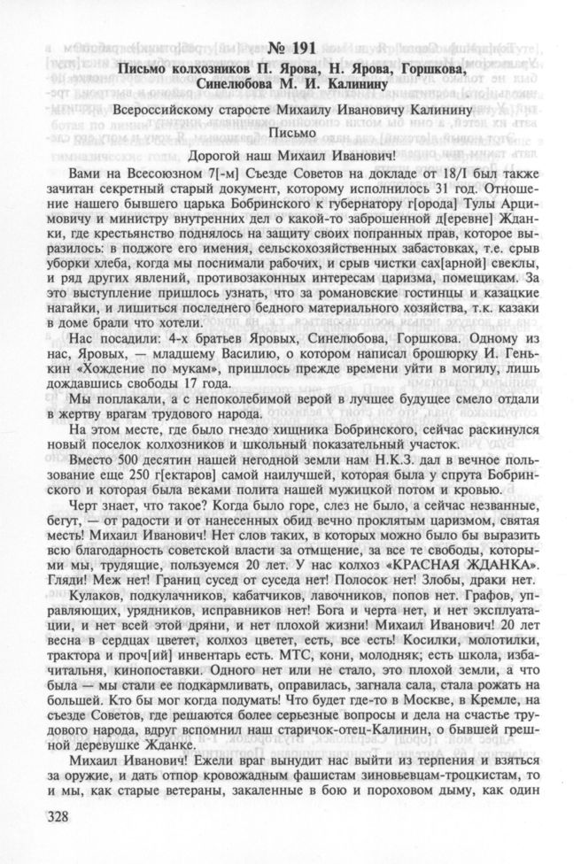 Письмо колхозников П. Ярова, Н. Ярова, Горшкова, Синелюбова М. И. Калинину. 24 января 1937 г. // РГАСПИ. Ф. 78. Оп. 1. Д. 593. Л. 5—6об. Подлинник, рукопись.