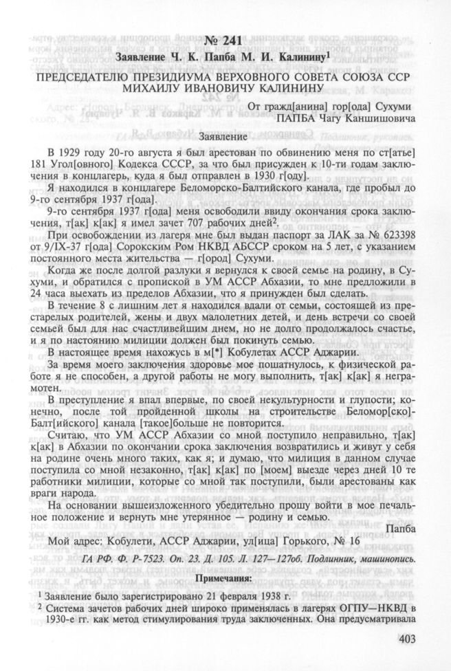 Заявление Ч. К. Папба М. И. Калинину. Не позднее 21 февраля 1938 г. // ГА РФ. Ф. P-7523. Оп. 23. Д. 105. Л. 127—127об. Подлинник, машинопись.