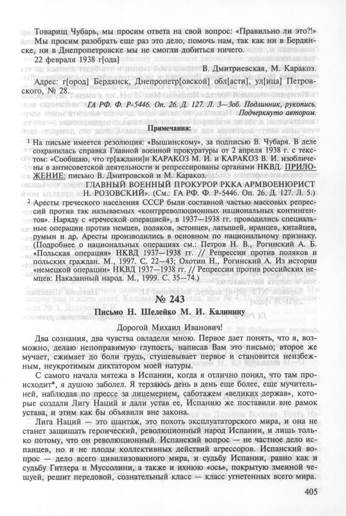 Письмо Н. Шелейко М. И. Калинину. 25 февраля 1938 г. // ГА РФ. Ф. P-7523. Оп. 23. Д. 129. Л. 181—182об. Подлинник, рукопись.