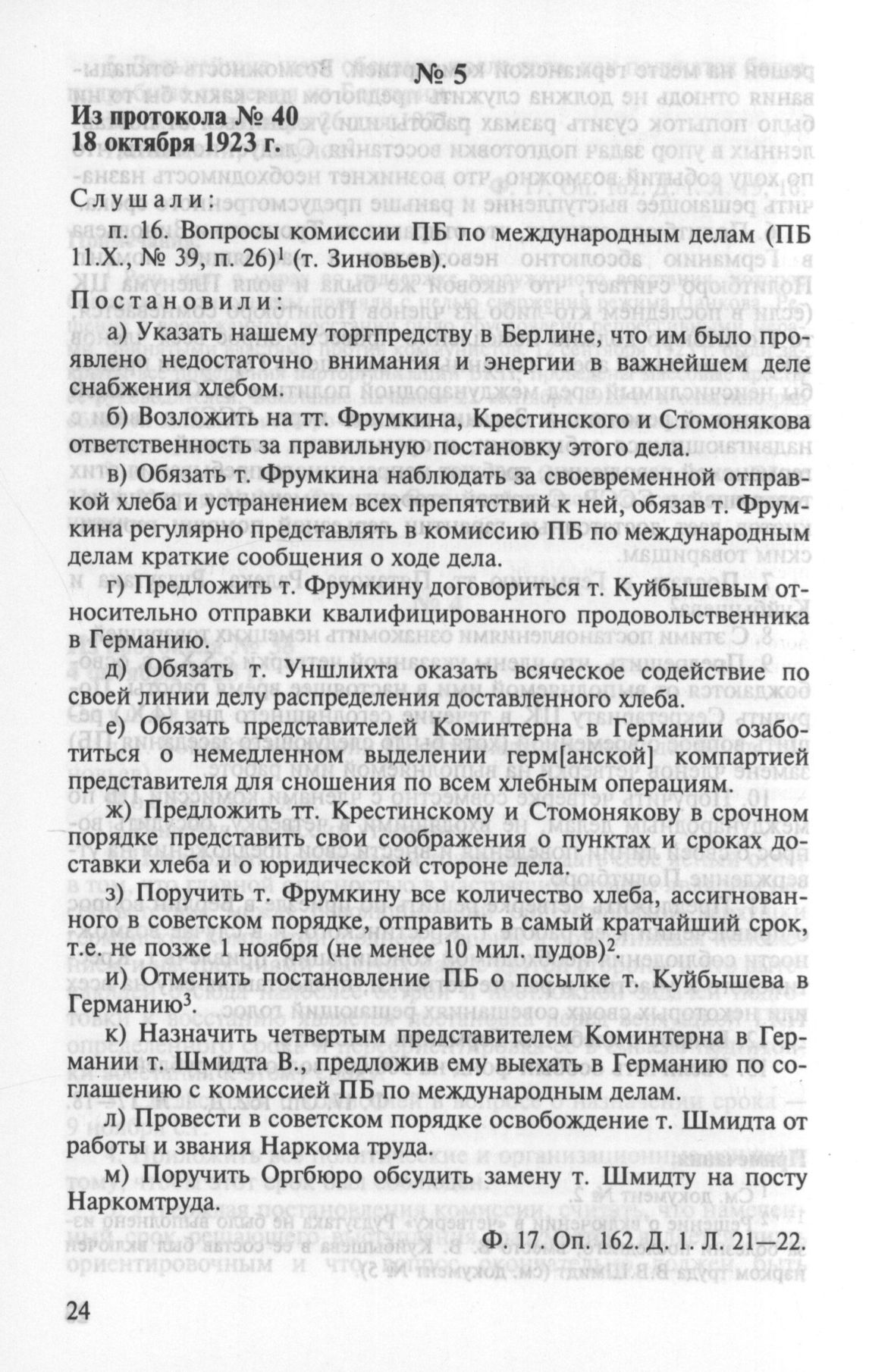 Особый протокол заседания Политбюро ЦК РКП(б) № 40. 18 октября 1923 г. // РГАСПИ. Ф. 17. Оп. 162. Д. 1. Л. 21-22.