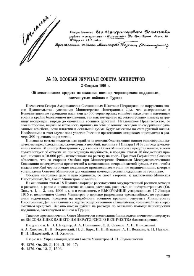 Особый журнал совета министров. 2 февраля 1916 г. Об ассигновании кредита на оказание помощи черногорским подданным, застигнутым войною в Турции