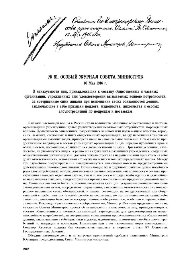 Особый журнал совета министров. 10 мая 1916 г. О наказуемости лиц, принадлежащих к составу общественных и частных организаций, учрежденных для удовлетворения вызываемых войною потребностей, за совершенные сими лицами при исполнении своих обязанностей деяния, заключающие в себе признаки подлога, мздоимства, лихоимства и особых злоупотреблений по подрядам и поставкам // РГИА Ф. 1276. Оп. 20. Д. 109. Л. 114а–115 об.; Ф. 1276. Оп. 12. Д. 113, 122; Су. 14 мая 1916 г. Отд. I. Ст. 1017.