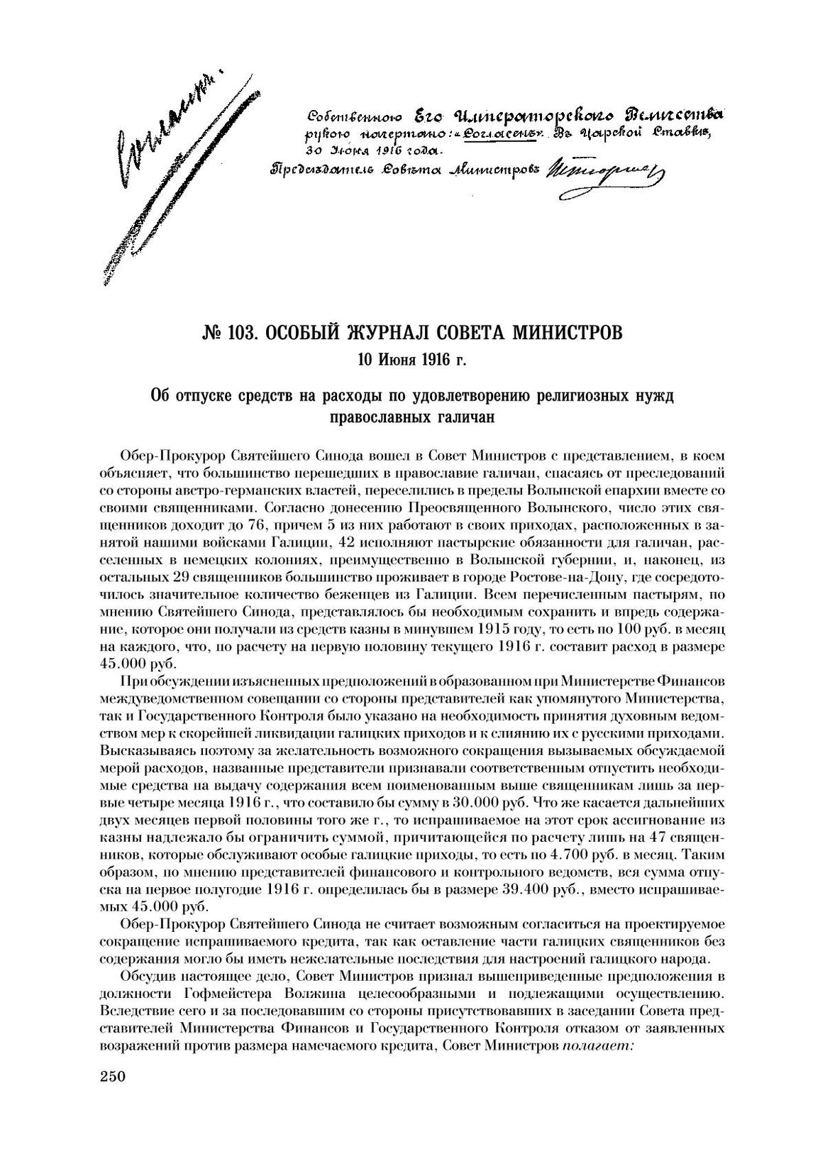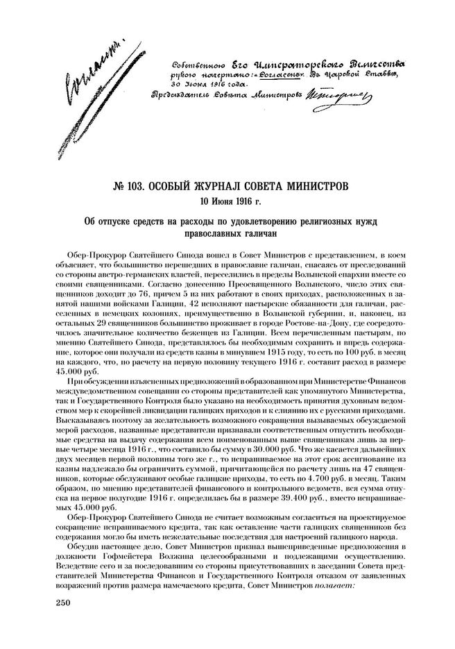 Особый журнал совета министров. 10 июня 1916 г. Об отпуске средств на расходы по удовлетворению религиозных нужд православных галичан