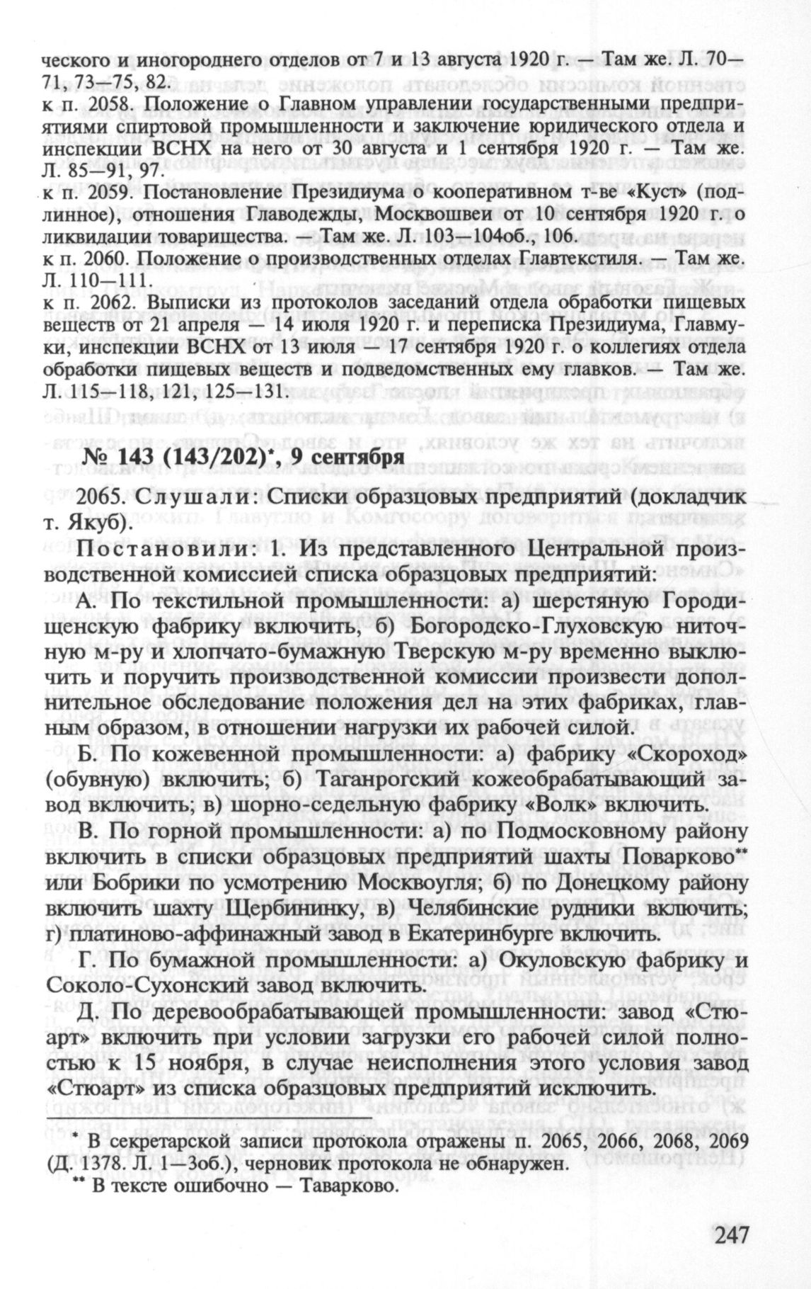 Протокол Президиума Высшего Совета Народного Хозяйства № 143 (143/202), 9 сентября // РГАЭ. Ф. 3429. Оп. 1. Д. 1377. Л. 4—5об. Подлинник. Машинопись с рукописной правкой.