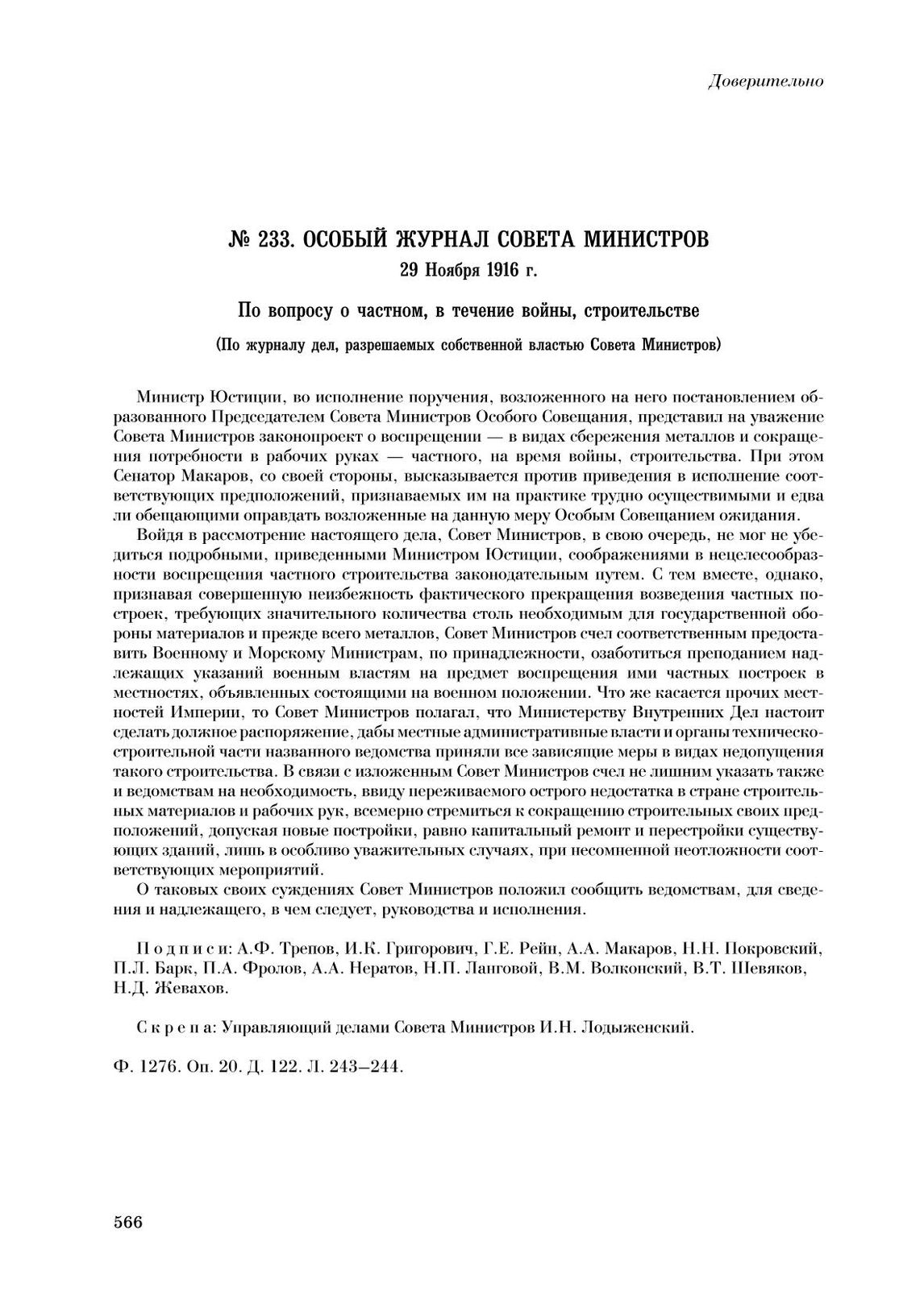 Особый журнал совета министров. 29 ноября 1916 г. По вопросу о частном, в течение войны, строительстве // РГИА Ф. 1276. Оп. 20. Д. 122. Л. 243–244.