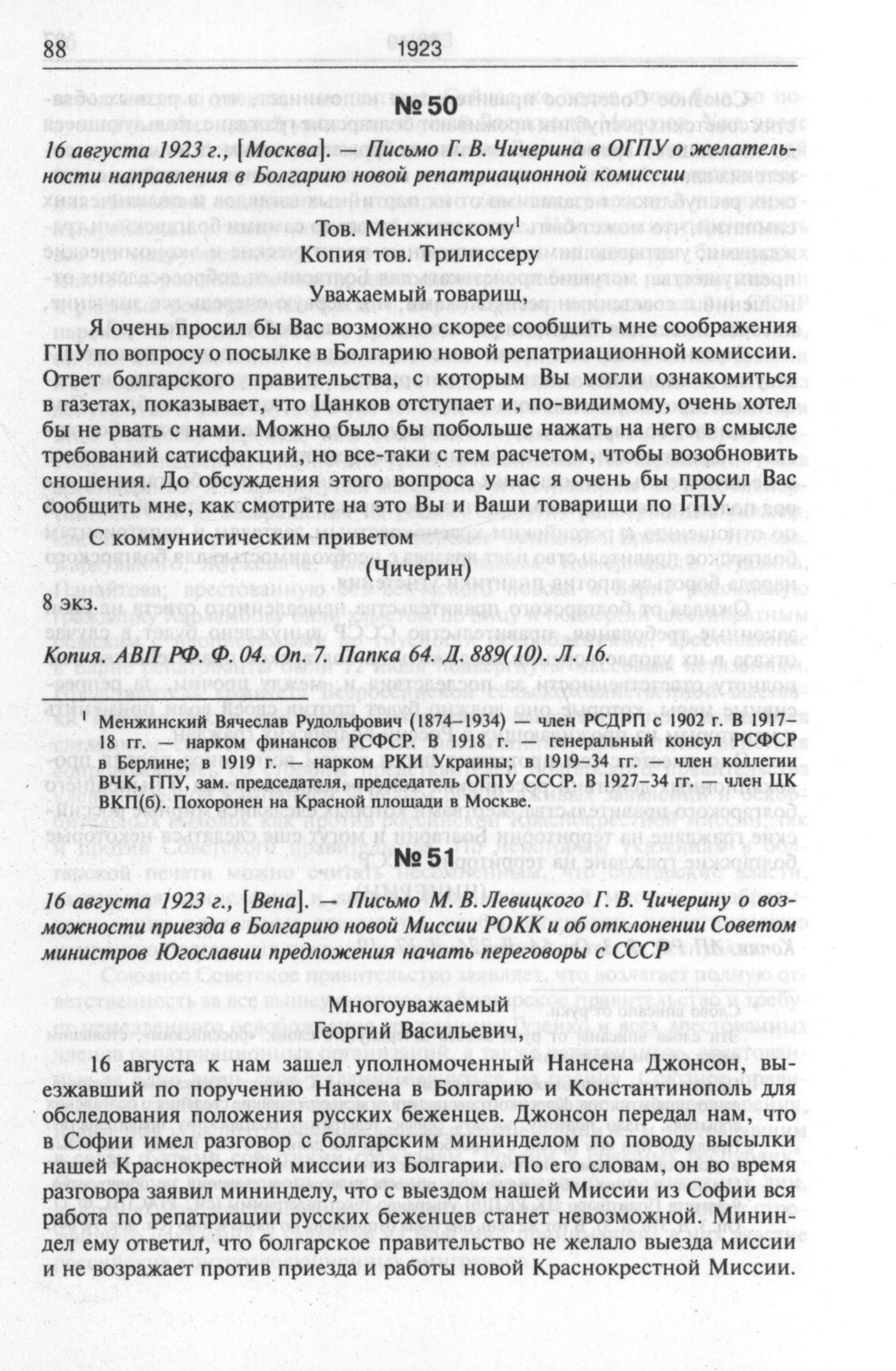 16 августа 1923 г., [Вена|. — Письмо М. В. Левицкого Г. В. Чичерину о возможности приезда в Болгарию новой Миссии РОКК и об отклонении Советом министров Югославии предложения начать переговоры с СССР // Копия. АП РФ. Ф. 3. Оп. 64. Д. 224. Л. 20-21.