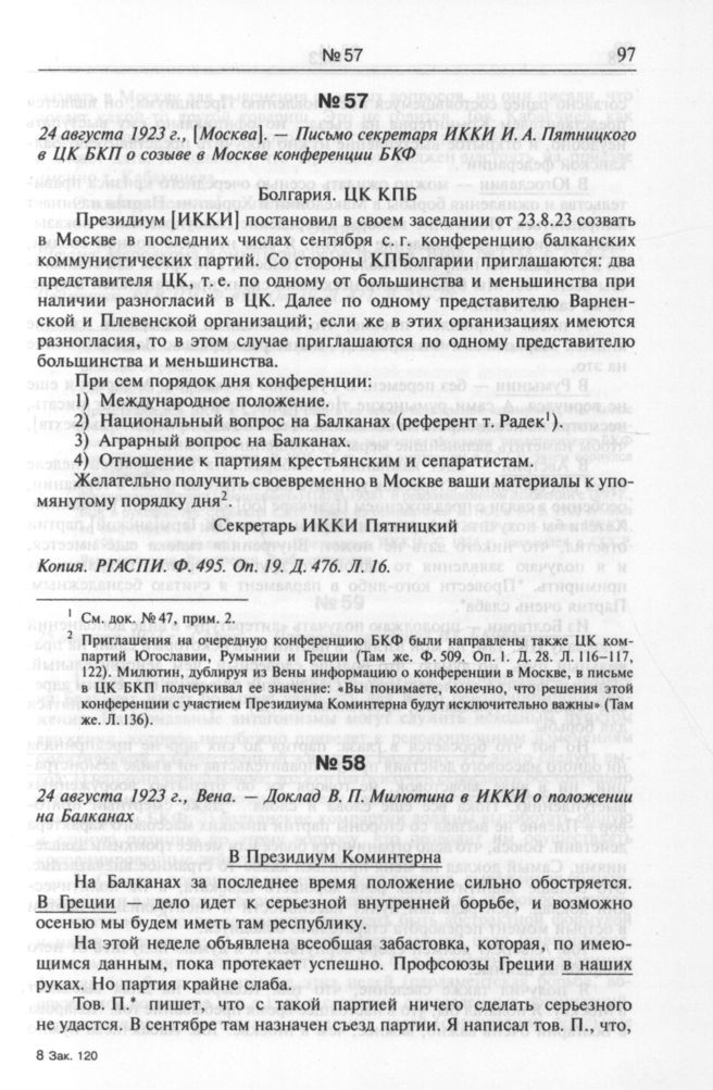 24 августа 1923 г., [Москва]. — Письмо секретаря ИККИ И. А. Пятницкого в ЦК БКП о созыве в Москве конференции БКФ // Копия. РГАСПИ. Ф. 495. Оп. 19. Д. 476. Л. 16.