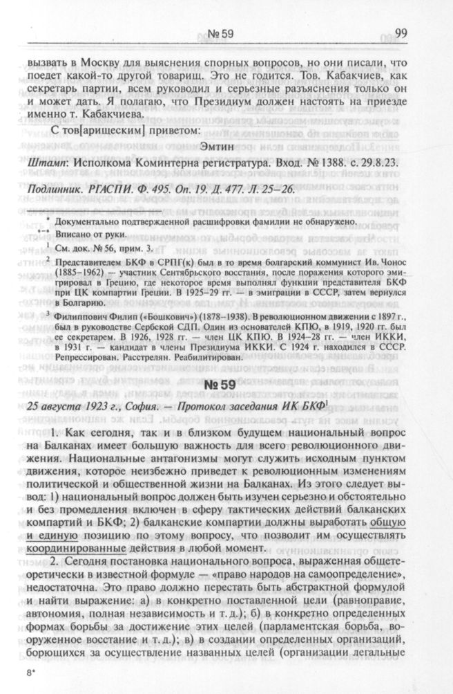 25 августа 1923 г., София. — Протокол заседания ИК БКФ // Копия на немецком языке. РГАСПИ. Ф. 509. Оп. 1. Д. 28. Л. 106-110.