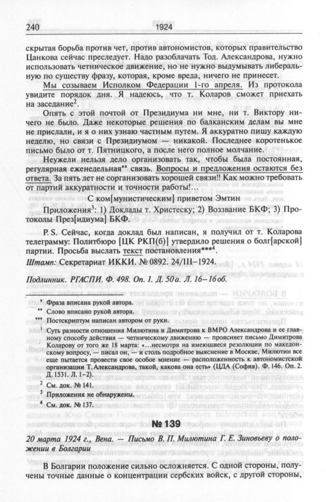 20 марта 1924 г., Вена. — Письмо В. П. Милютина Г. Е. Зиновьеву о положении в Болгарии // Автограф. РГАСПИ. Ф. 498. Оп. 1. Д. 50а. Л. 18-19.