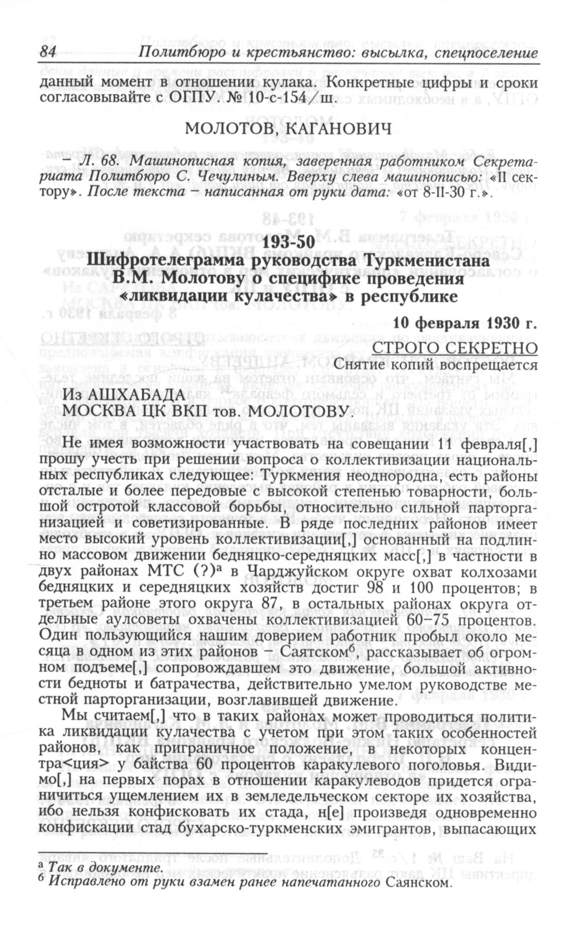 Шифротелеграмма руководства Туркменистана В.М. Молотову о специфике проведения «ликвидации кулачества» в республике. 10 февраля 1930 г. // АП РФ. Ф. 3. Оп. 30. Д. 193. Л. 71. Машинописный подлинник на бланке шифротелеграммы ЦК ВКП(б).