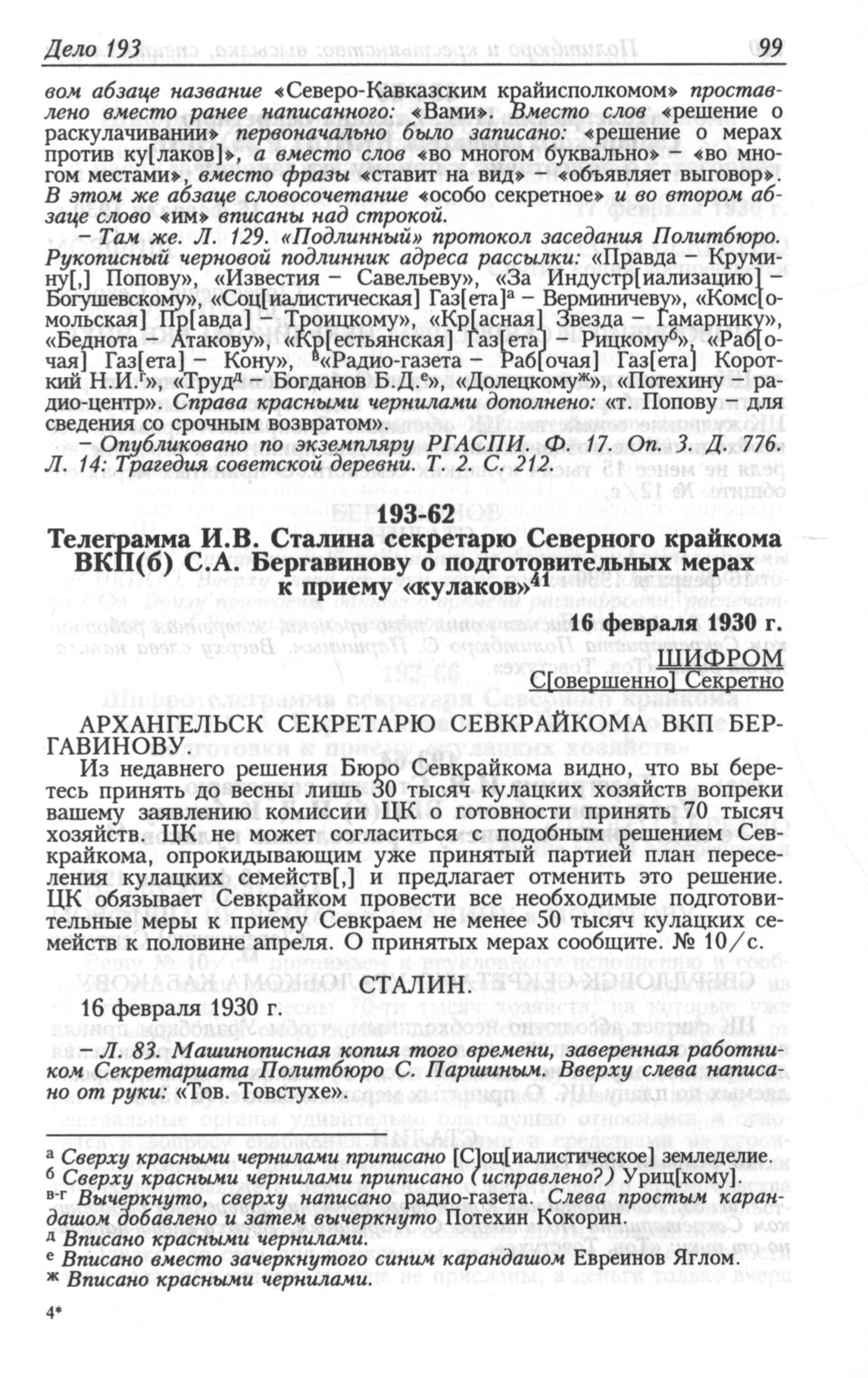 Телеграмма И.В. Сталина секретарю Северного крайкома ВКП(б) С.А. Бергавинову о подготовительных мерах к приему «кулаков». 16 февраля 1930 г. // АП РФ. Ф. 3. Оп. 30. Д. 193. Л. 83. Машинописная копия того времени.