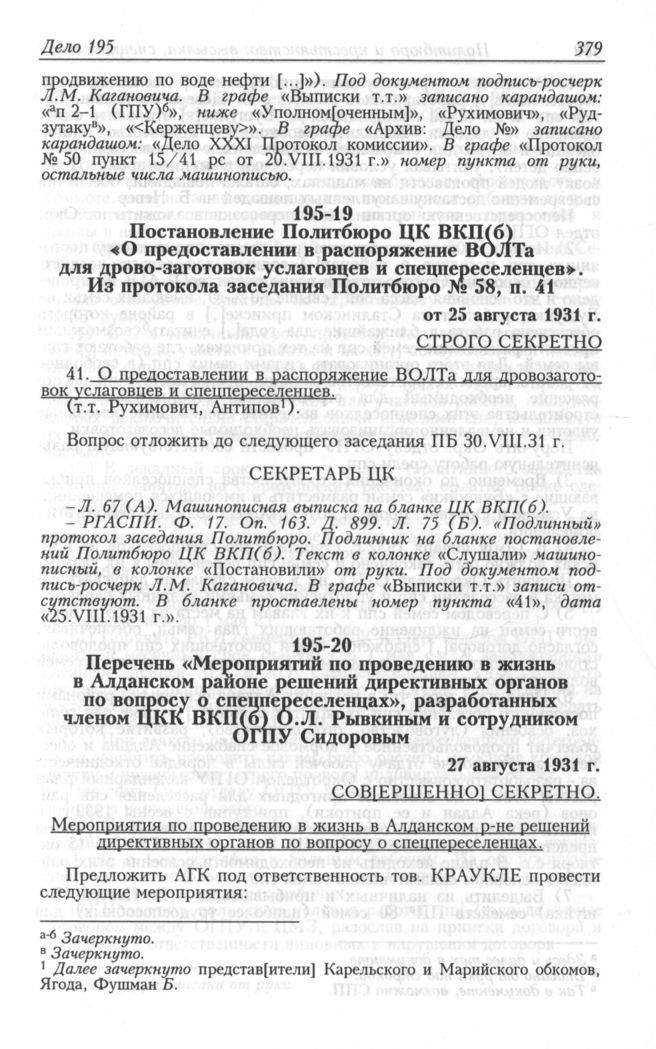 Перечень «Мероприятий по проведению в жизнь в Алданском районе решений директивных органов по вопросу о спецпереселенцах», разработанных членом ЦКК ВКП(б) О.Л. Рывкиным и сотрудником ОГПУ Сидоровым. 27 августа 1931 г. // АП РФ. Ф. 3. Оп. 30. Д. 195. Л. 106-110. Машинописный экземпляр того времени.; РГАСПИ. Ф. 17. Oп. 120. Д. 52. Л. 227-231.