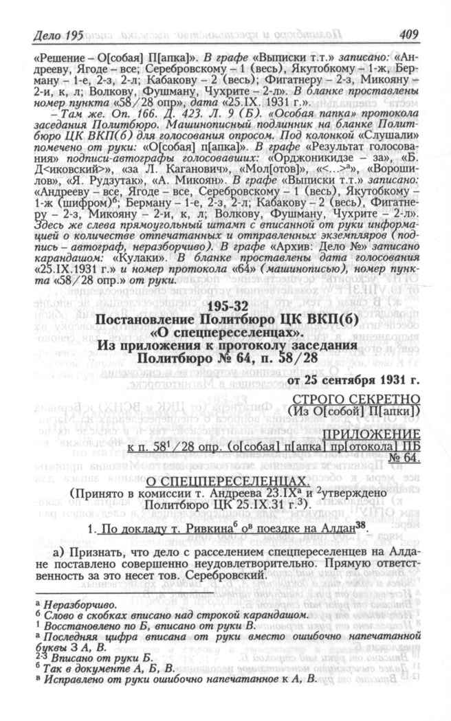 Постановление Политбюро ЦК ВКП(б) «О спецпереселенцах». Из приложения к протоколу заседания Политбюро № 64, п. 58/28 от 25 сентября 1931 г. // АП РФ. Ф. 3. Оп. 30. Д. 195. Л. 92 (А). Машинописная копия того времени.; РГАСПИ. Ф. 17. Oп. 166. Д. 423. Л. 10-12 (Б).; РГАСПИ. Ф. 17. Oп. 162. Д. 11. Л. 14 (В).