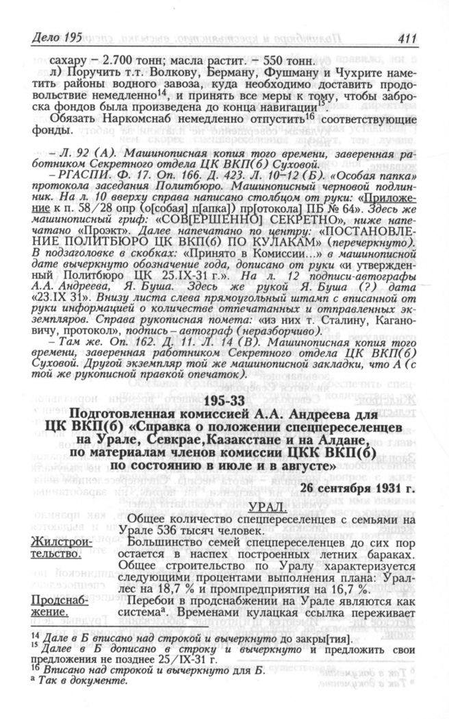 Подготовленная комиссией А.А. Андреева для ЦК ВКП(б) «Справка о положении спецпереселенцев на Урале, Севкрае, Казакстане и на Алдане, по материалам членов комиссии ЦКК ВКП(б) по состоянию в июле и в августе». 26 сентября 1931 г. // АП РФ. Ф. 3. Оп. 30. Д. 195. Л. 123-129. Машинописный экземпляр того времени.