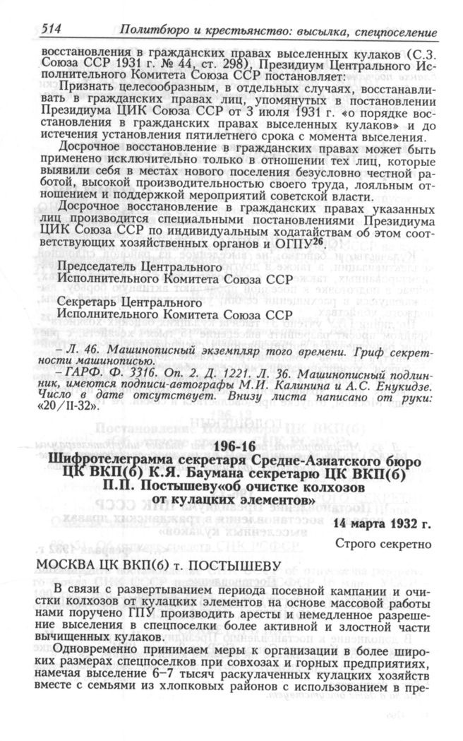 Шифротелеграмма секретаря Средне-Азиатского бюро ЦК ВКП(б) К.Я. Баумана секретарю ЦК ВКП(б) П.П. Постышеву «об очистке колхозов от кулацких элементов». 14 марта 1932 г. // АП РФ. Ф. 3. Оп. 30. Д. 196. Л. 48. Заверенная машинописная копия.; РГАСПИ. Ф. 17. Oп. 166. Д. 452. Л. 6-6 об.