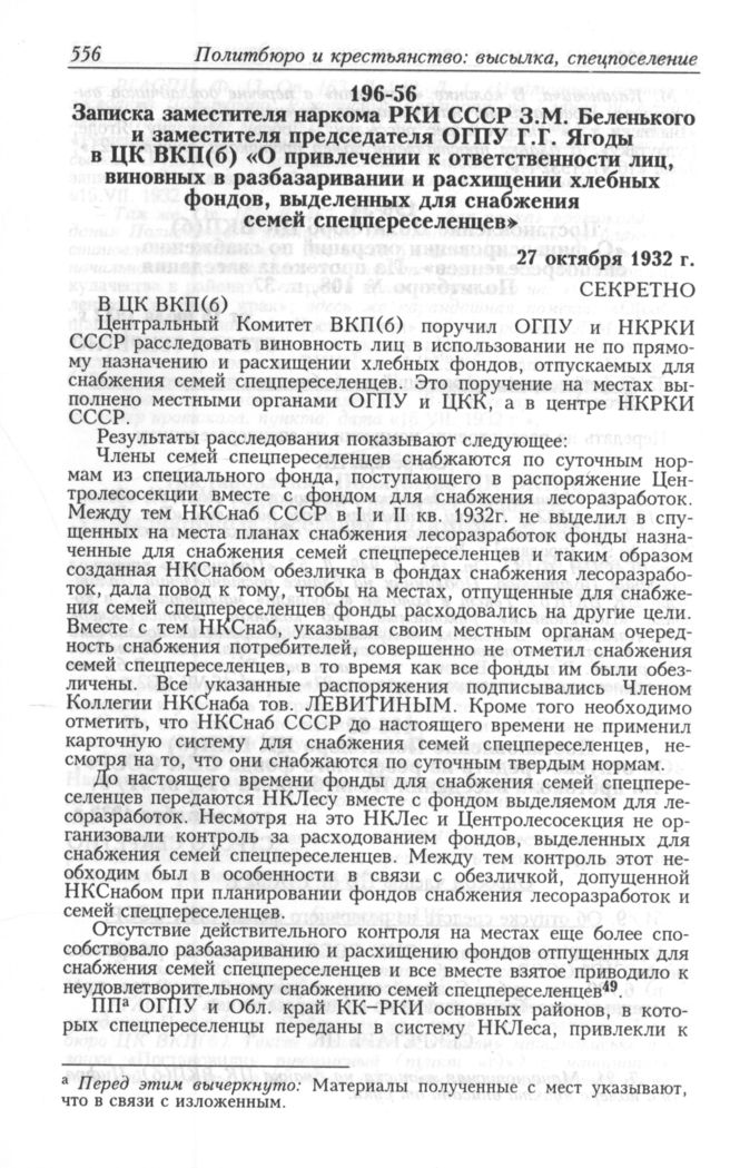 Записка заместителя наркома РКИ СССР З.М. Беленького и заместителя председателя ОГПУ Г.Г. Ягоды в ЦК ВКП(б) «О привлечении к ответственности лиц, виновных в разбазаривании и расхищении хлебных фондов, выделенных для спецпереселенцев». 27 октября 1932 г. // АП РФ. Ф. 3. Оп. 30. Д. 196. Л. 93-93 об. Машинописный подлинник на бланке ЦКК ВКП(б)-НК РКИ СССР, подписи-автографы.