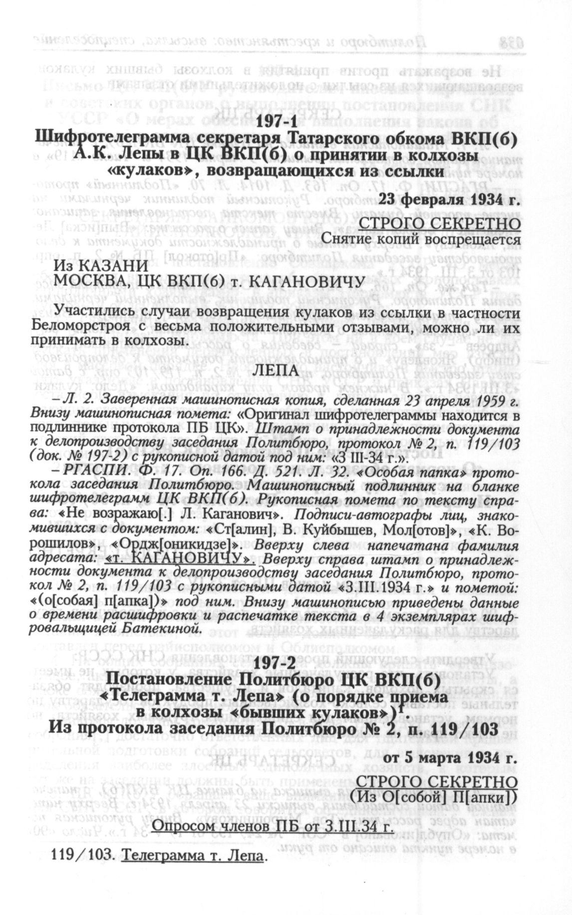 Шифротелеграмма секретаря Татарского обкома ВКП(б) А.К. Лепы в ЦК ВКП(б) о принятии в колхозы «кулаков», возвращающихся из ссылки. 23 февраля 1934 г. // АП РФ. Ф. 3. Оп. 30. Д. 197. Л. 2. Заверенная машинописная копия, сделанная 23 апреля 1959 г.; РГАСПИ. Ф. 17. Oп. 166. Д. 521. Л. 32.