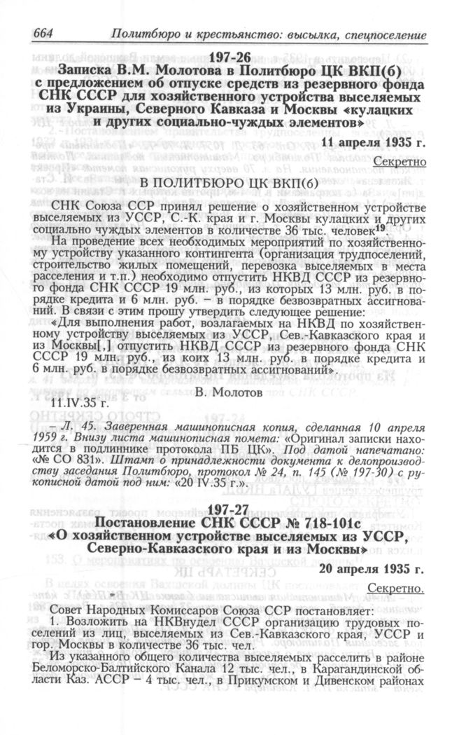 Записка В.М. Молотова в Политбюро ЦК ВКП(б) с предложением об отпуске средств из резервного фонда СНК СССР для хозяйственного устройства выселяемых из Украины, Северного Кавказа и Москвы «кулацких и других социально-чуждых элементов». 11 апреля 1935 г. // АП РФ. Ф. 3. Оп. 30. Д. 197. Л. 45. Заверенная машинописная копия, сделанная 10 апреля 1959 г.