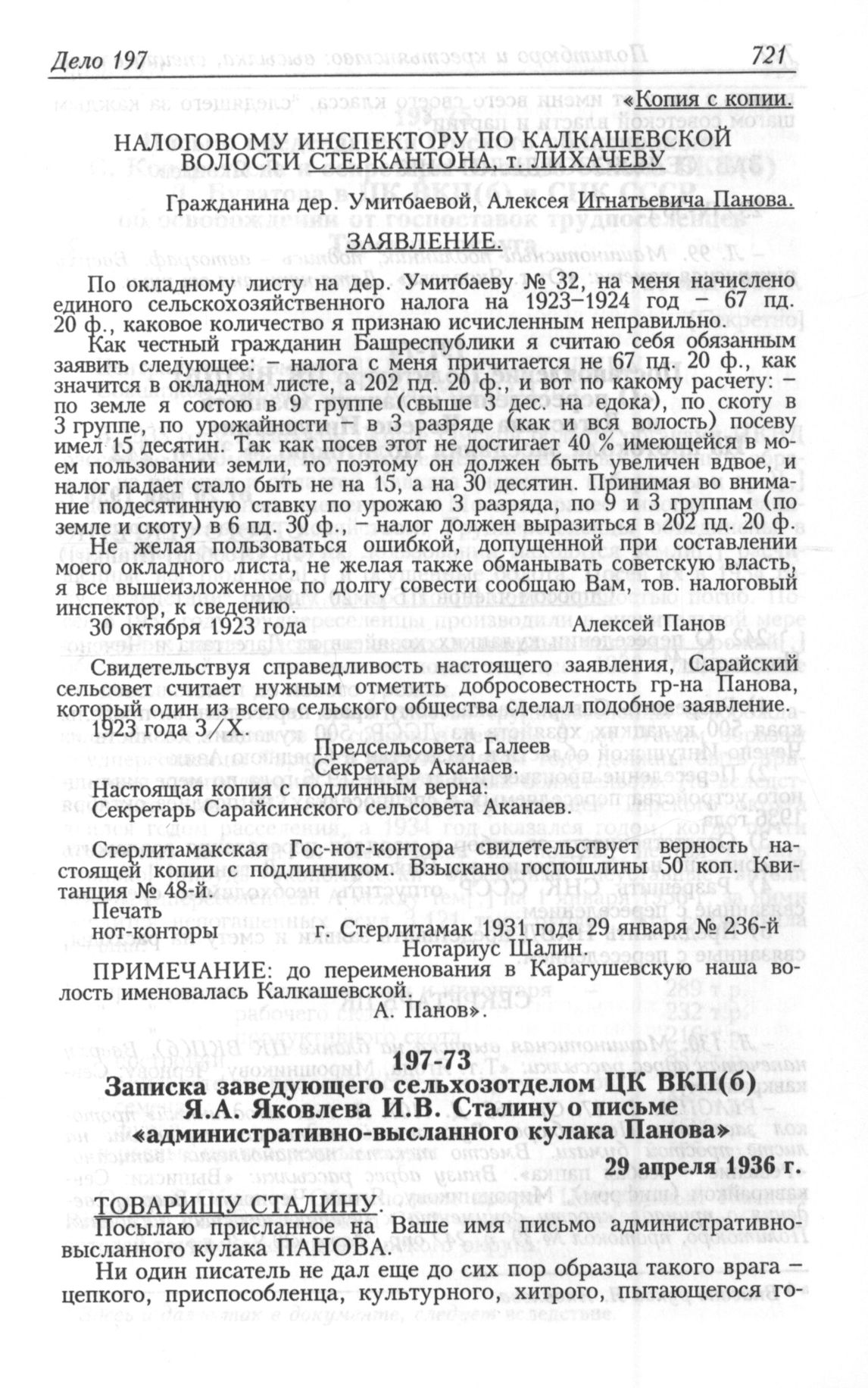 Записка заведующего сельхозотделом ЦК ВКП(б) Я.А. Яковлева И.В. Сталину о письме «административно-высланного кулака Панова». 29 апреля 1936 г.