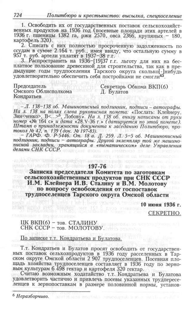 Записка председателя Комитета по заготовкам сельскохозяйственных продуктов при СНК СССР И.М. Клейнера И.В. Сталину и В.М. Молотову по вопросу освобождения от госпоставок трудпоселенцев Тарского округа Омской области. 10 июня 1936 г. // АП РФ. Ф. 3. Оп. 30. Д. 197. Л. 137. Машинописный подлинник, подпись-автограф.