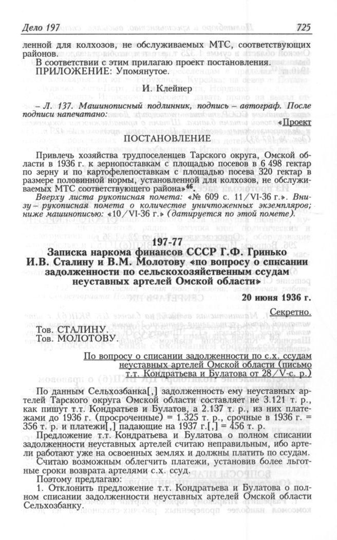Записка наркома финансов СССР Г.Ф. Гринько И.В. Сталину и В.М. Молотову «по вопросу о списании задолженности по сельскохозяйственным ссудам неуставных артелей Омской области». 20 июня 1936 г.